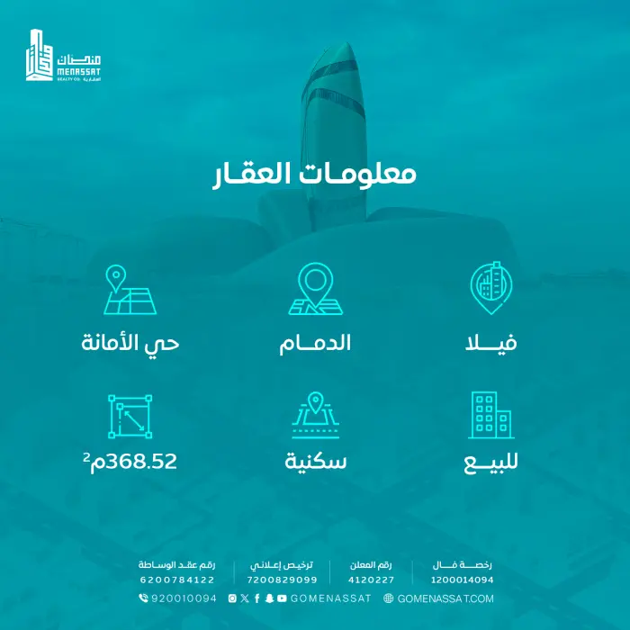 تتكــّّون الفــيال مــن حــوش خارجــي يضــم كــراج ســيارة وديوانيـة خارجيـة مسـتقلة مـزّّودة بـدورة ميـاه واحـدة. الــدور األرضــي يشــتمل علــى مطبــخ مغلــق وآخــر مفتـوح، إضافـة إلـى مجلـس، ومقلـط، وصالـة معيشـة واســعة،أما الــدور األول فيتكــّّون مــن أربــع غــرف نــوم ماســتر وصالة،ويضــم الــدور الثانــي غرفــة خادمــة مــع دورة ميـاه، وغرفـة غسـيل، إلـى جانـب سـطح خارجـي.