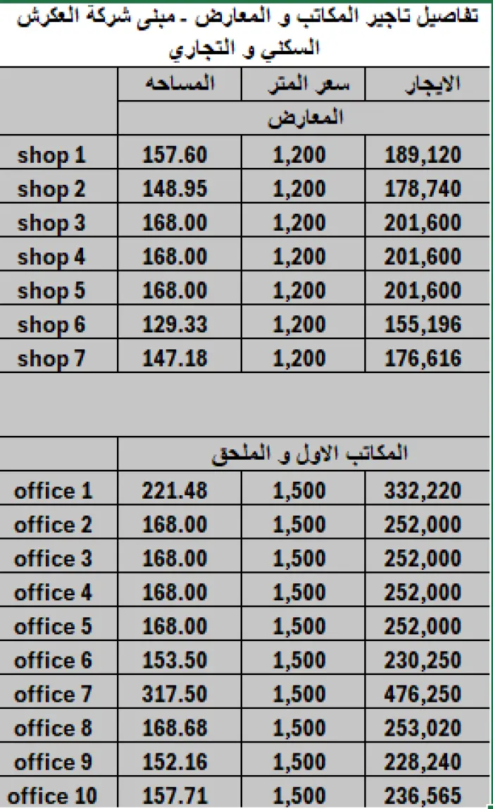| رقم المكتب | المساحة (م²) | السعر للمتر | الإجمالي التقريبي |