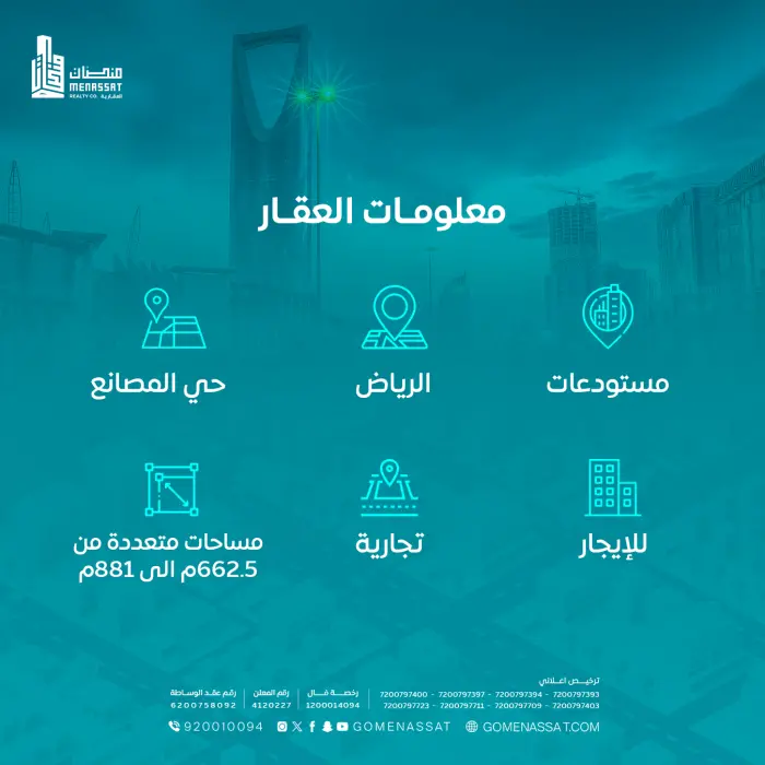تحتوي على 3 مكاتب ودورتي مياه فــي الــدور األرضــي توجــد غرفــة حــارس ومكتــب ودورات الميــاه ومطبــخ للخدمــات الموقع قريب من حراج بن قاسم الجديد يقع عند تقاطع شارع عرفات والنصر )حي المصانع( مرخص خطورة متوسطة واجهات كالدينق مواقف سيارات األسقف من نوع )ساندويتش بنل( وهي عازلة للحرارة واألمطار مواقف للشاحنات وسهولة دخول وخروج الشاحنات عداد كهرباء مستقل لكل مستودع منطقة تنزيل وتحميل نظام تصريف مطري مستقل لكل مستودع موقع عام بمساحات خضراء واسعة لكل المستودعات السالمة والدفاع المدني أنظمة دفاع مدني لمقاومة الحرائق نظام إنذار حريق مستقل لكل مستودع ممر هروب وخدمات مستقلة لكل مستودع
